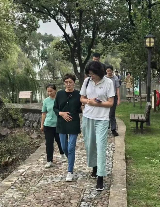 叶莉则身着浅色 T 恤和宽松休闲裤,打扮虽朴素,可那由内而外散发出来的优雅气质,就好像与景融为了一体。