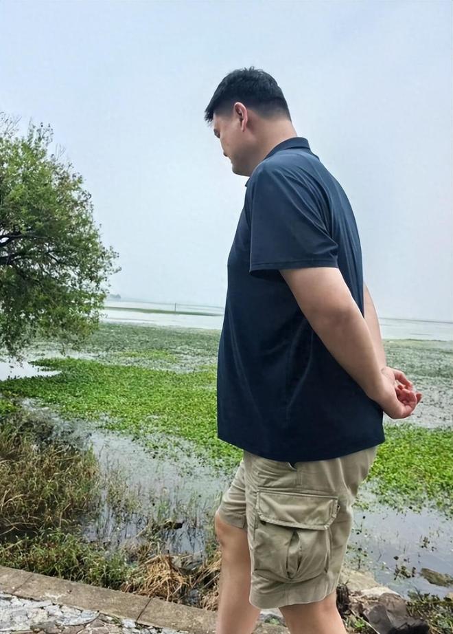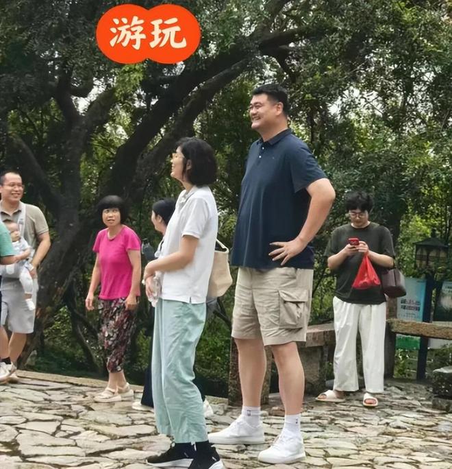 姚明一身藏青短袖搭配卡其短裤,脸上挂着那标志性的爽朗笑容,时不时地驻足欣赏着周围的景致,他那高大的身影在人群中格外显眼,却又显得那样惬意自在。