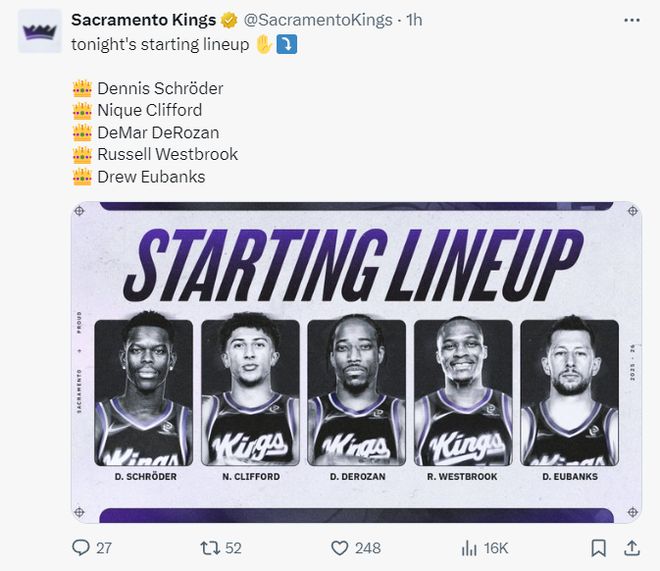 勇士队这场比赛库里、追梦、巴特勒都因伤缺席,科尔用了波杰姆斯基、理查德、库明加、穆迪、波斯特的先发阵容,而国王这边也轮休了拉文、萨博尼斯、卡德维尔三人,威少、施罗德、德罗赞、尤班克斯、克利福德的先发阵容,威少继续打先发的PF。