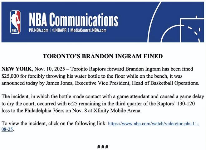 北京时间11月11日,NBA篮球运营总裁、执行副总裁詹姆斯-琼斯今日宣布,多伦多猛龙队前锋布兰登-英格拉姆因在替补席上用力将水瓶摔向地面,被处以2.5万美元罚款。